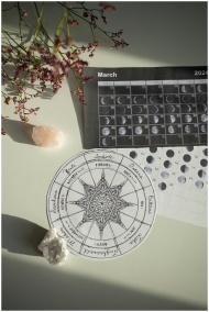 Aesthetic top view of a moon phases calendar with crystals and flowers on a desk.