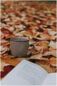 Ceramic mug and open book amidst colorful autumn leaves in a park setting.