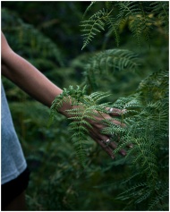 A hand gently touches lush green fern leaves in a