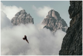 Breathtaking view of the Dolomites with a bird soaring through misty clouds, creating a dramatic natural scene.