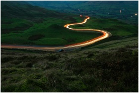 Majestic night view of light trails on a winding road in the English countryside.