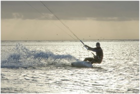 A thrilling kiteboarding scene against a picturesq