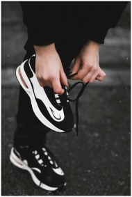 Close-up of an athlete tying black and white sneak
