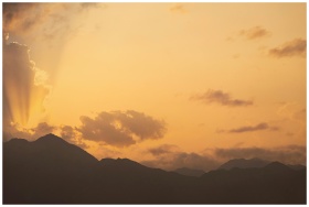 Beautiful sunset over Omani mountains with dramatic sunrays piercing through clouds.