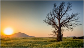 Serene sunset view of a lone tree in a lush field