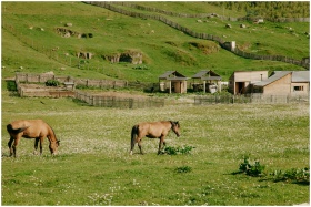 Two horses grazing in a scenic countryside field with rustic farm buildings.