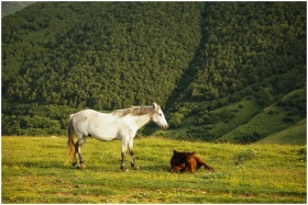 Two horses relaxing in a lush mountain pasture dur