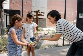 Two girls and a woman enjoying a playful moment with parrots in an outdoor aviary.