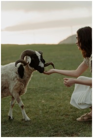 A woman gently feeds a horned sheep in a peaceful pasture at dusk, embodying harmony with nature.