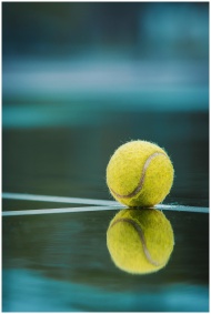 Close-up of a tennis ball reflecting on a wet cour