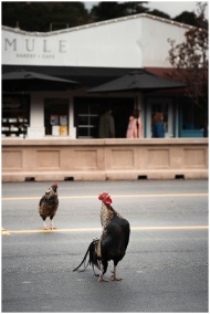 Two roosters wander freely on a small town street with a bakery café in the background.
