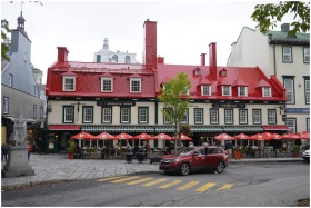 Scenic view of vibrant bistro in Quebec City's historic district with iconic red roof and lively terrace.