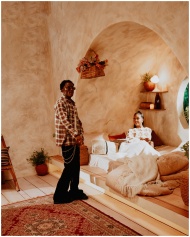 A warm, inviting indoor space with two people relaxing, featuring cozy decor and earthy tones.