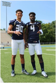 Two athletes in football uniforms pose on a sunny outdoor field.