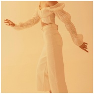 Elegant off-shoulder blouse paired with white pants, exuding a minimalist and stylish vibe.