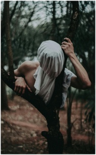 A mysterious figure with a covered face climbs a tree in an eerie forest, creating a surreal atmosphere.
