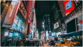 Bustling evening scene in New York City's iconic T