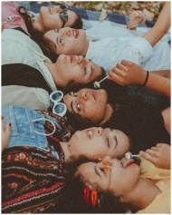 A group of women lying outdoors on a blanket, enjoying lollipops and the sunny day with smiles.