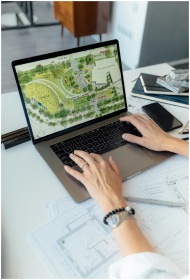 Architect working on landscape plan displayed on laptop with hands typing on keyboard.