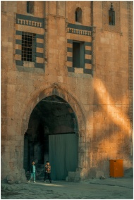 View of a historic mosque with a minaret in an urb