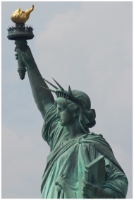 Iconic close-up of the Statue of Liberty against a