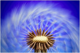 Artistic close-up of a dandelion with seeds dispersing against a vibrant blue background.