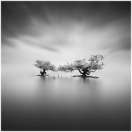 Long exposure monochrome photograph of trees in a tranquil Indonesian lake.
