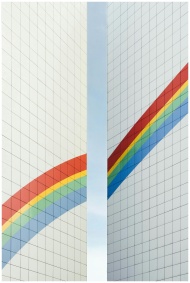 A striking view of modern architecture featuring a rainbow pattern on a Berlin building.