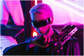 A stylish woman in cyberpunk attire poses with a f