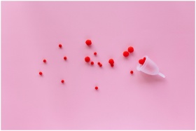 Menstrual cup with red elements on pink background