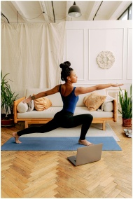 An African American woman performing the warrior p