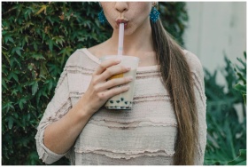 A young woman savoring a delicious bubble tea in an outdoor setting, displaying a relaxed lifestyle vibe.
