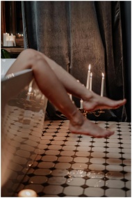 A serene setting with legs in a bathtub, surrounded by candles for a relaxing bath.
