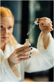 Blonde woman in a bathrobe applying serum with a dropper for skincare routine.