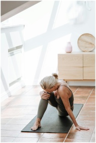 Adult woman doing yoga in a bright, sunlit room, showcasing a serene lifestyle moment.