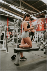 Woman kneeling on a bench exercising with dumbbell