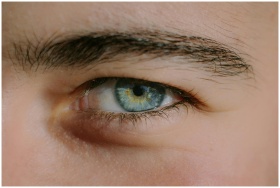 Detailed close-up image of a human eye with blue iris, capturing intricate details of the eyebrow and eyelashes.