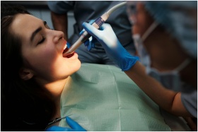 Close-up of a woman receiving dental treatment with modern equipment at a clinic.