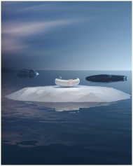 A surreal floating bathtub on an iceberg in a calm
