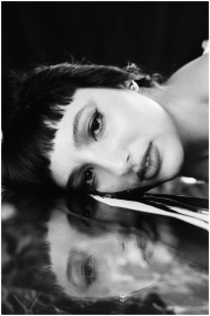 Artistic black and white portrait featuring a woman's reflection in a mirror.