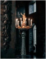 A detailed view of a golden statue candlestick in a dimly lit historic church interior.