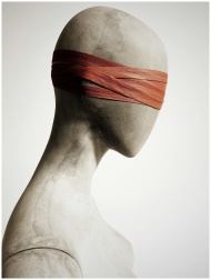A blindfolded mannequin creates an abstract and th