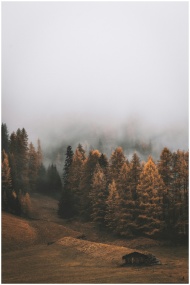 Serene autumn forest landscape with fog enveloping colorful trees and a small cabin in the distance.