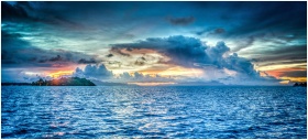 Vibrant sunset over tropical ocean with dramatic clouds and distant island.