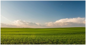 Expansive green meadow under a blue sky with wind