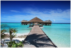 Scenic view of a wooden boardwalk leading to serene overwater bungalows at an island resort.