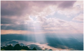 Gentle sunbeams breaking through a cloudy sky over a serene landscape.