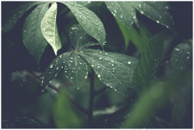 Close-up of vibrant green leaves covered with dewdrops, showcasing natural freshness.