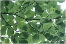 Close-up view of lush green leaves with sunlight filtering through, creating a natural serene backdrop.