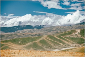 Expansive landscape with rolling hills under a vibrant, cloud-streaked sky.